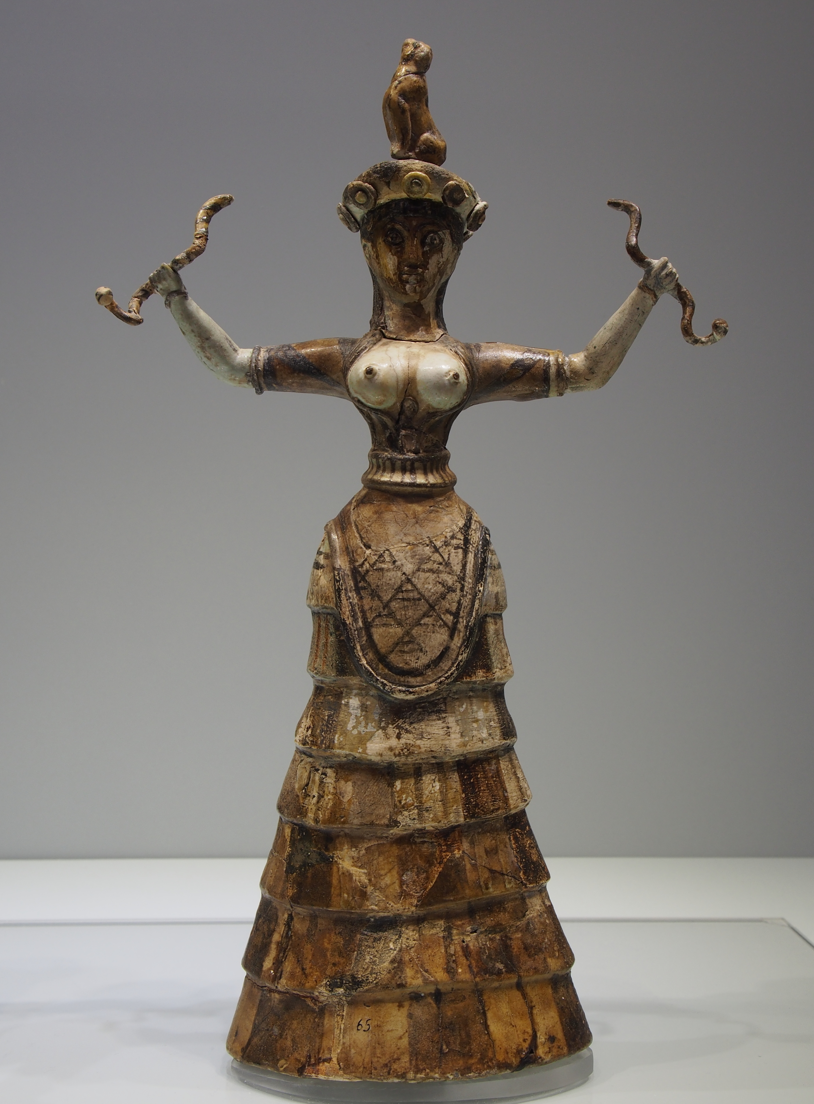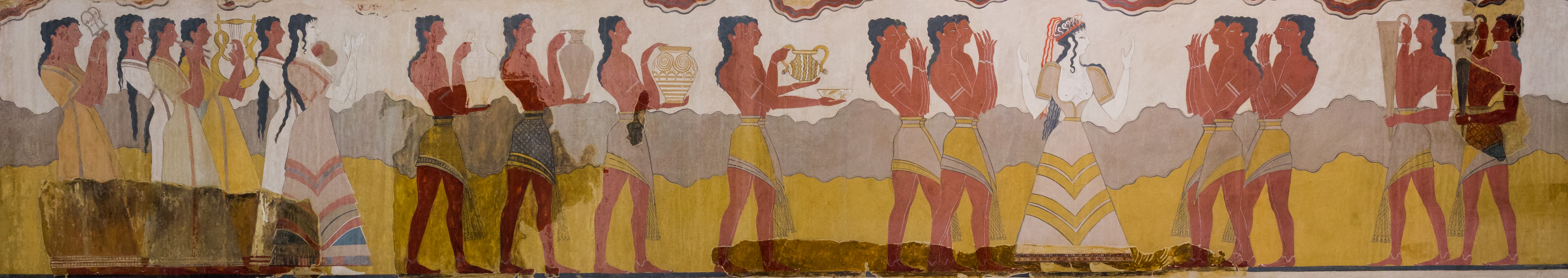 The Minoans lived on the Island of Crete at the beginning of the Bronze Age, most prominently 1900 – 1750sh BC. The name of the people and culture is from the mythical King Minos. This was a fairly advanced society, they were the first in Europe to have paved roads, running water: elaborate indoor pipe systems and “facilities” in their 3 and 4 story palaces. These palaces were a place for concentrated political and economic power, artistic activity, and possibly the center for redistribution of agriculture commodities. These were a large trades people, not only export but import. Exported items include timber, foodstuffs, cloth, olive oil, and fine handcrafted luxury items. They imported such things as tin, copper, silver, emery, fine stones, ivory, and manufactured objects.